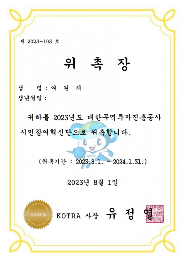 Letter of Appointment of KOTRA Citizen Participation Innovation Group 관련링크 mondereve 715 0 본문 Letter of Appointment of KOTRA Citizen Participation Innovation Group SHARE THIS PAGE 목록